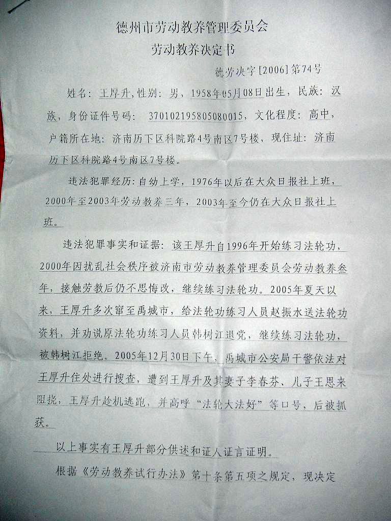从王厚升被疯狂绑架到禁止家人见面到非法劳教,禹城市公安局、大众日报社的相关恶人、省劳教局、王村劳教所沆瀣一气,不断用谎言罗织罪名,致使《劳教通知书》漏洞百出。大众日报社邪党党委书记管义杰至今不敢给家人《劳教通知书》原件,不知其中搞了什么鬼。为了罗织非法劳教的理由,管义杰2006年1月19日曾跑到禹城看守所去诱供,回来说王厚升在12月份回禹城二次;而在2006年2月6日,在家人强烈要求下,管义杰才把《劳教通知书》复印件给了家人。