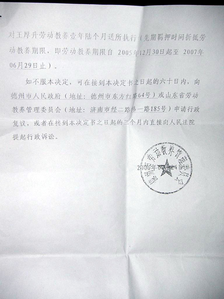复印件上却又说王厚升“夏天多次窜到禹城”。在2月6日下午当家人索要劳教决定书原件时,保卫处的张宪新说:“要是给你原件,你就不能申请复议了。”2月8日家人又去要劳教决定书原件,管义杰则改口说:“复印件和原件是一样的,你要是要原件,那就必须签字。”家人表示拿到原件是我们受迫害家属的正当权利,凭什么扣押?管义杰拒绝了家人索要原件的请求。大众日报社(山东省委机关报)如此蛮横无理真是咄咄怪事!