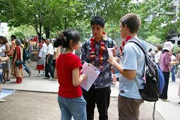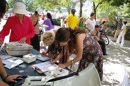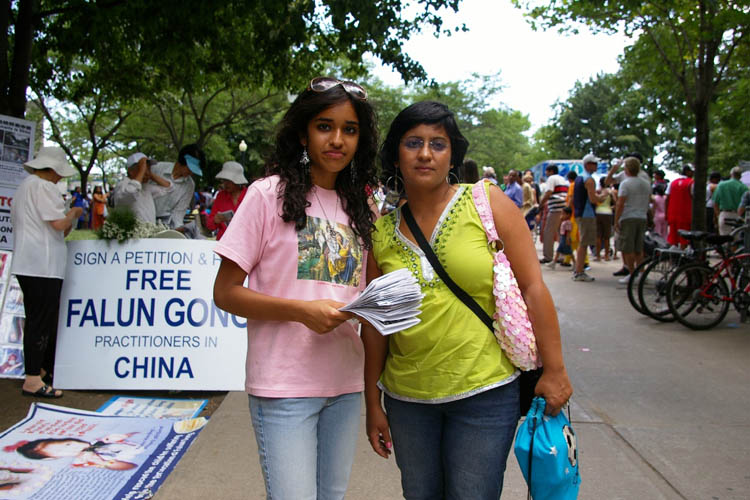 来参加庆祝活动的印度裔母女俩,读了学员给的传单后立即签了名。15岁的女儿要帮助发传单。经妈妈同意后,她拿着传单跟学员站在一起发,她对着匆匆而过的人流喊着:“请大家认真的看一看这一震惊的消息,请大家帮忙签名,制止残酷的暴行。”听到她的呼喊声,很多人接过了她手上的传单,并纷纷来签名。