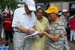 7月15日正好是印度社区到多伦多中心岛庆祝他们的宗教节日,在渡轮码头等船的人非常多。法轮功学员在码头入口处打出了“请签名呼吁制止迫害法轮功”等展板,向人群派发揭露中共迫害法轮功的真相资料及征集签名。