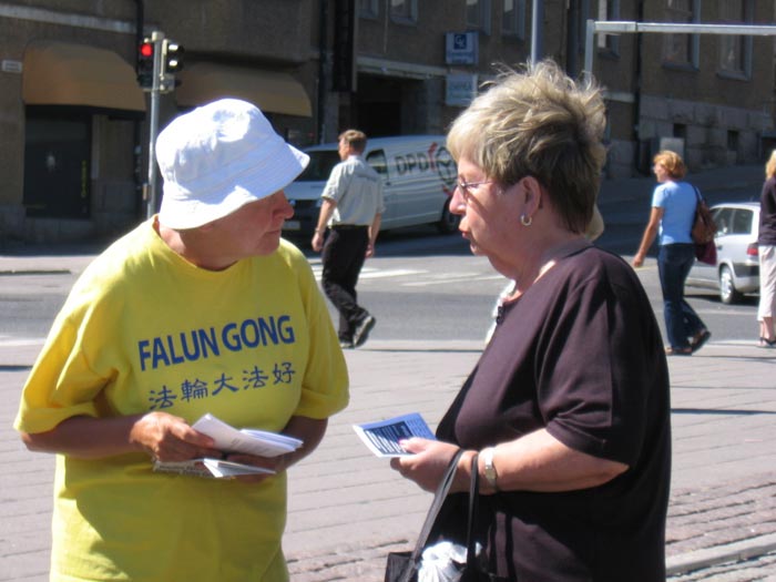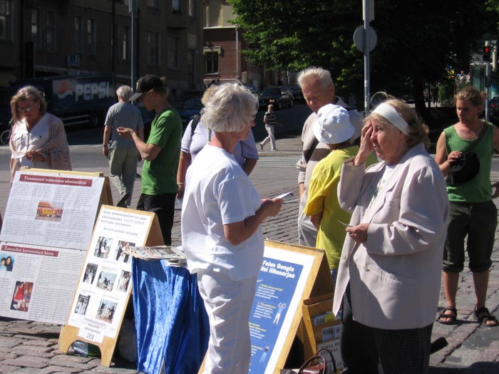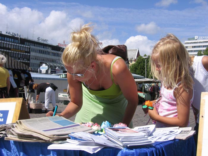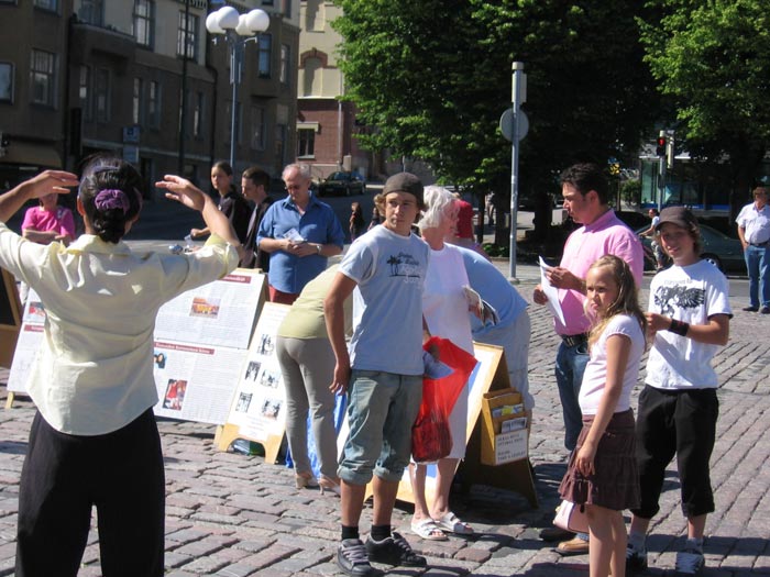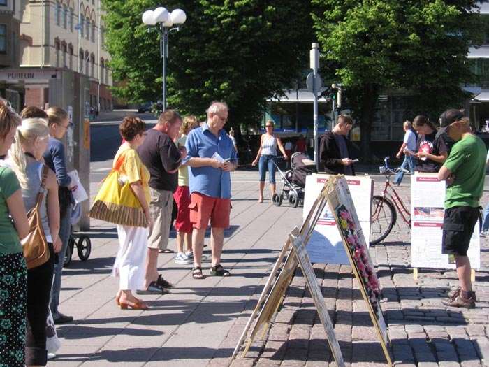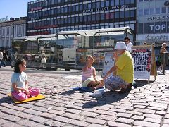 【明慧网2006年7月17日】2006年7月13-15日三天,芬兰部份法轮功学员来到南部城市土尔库(Turku)露天市场,举办揭露中共迫害法轮功罪行的图片展和讲真相活动。