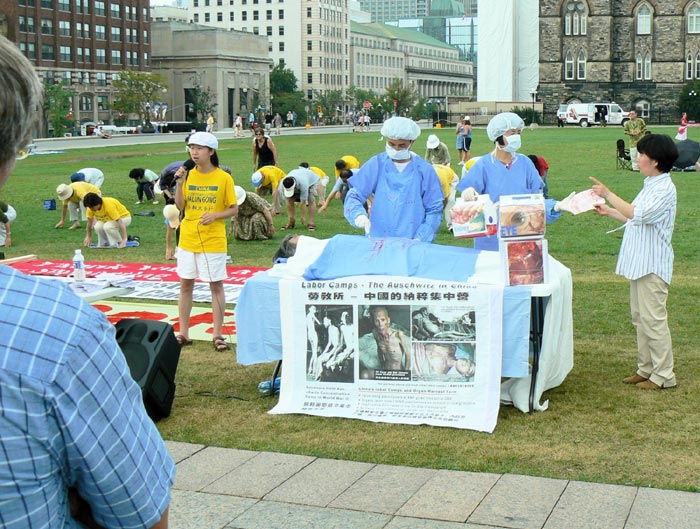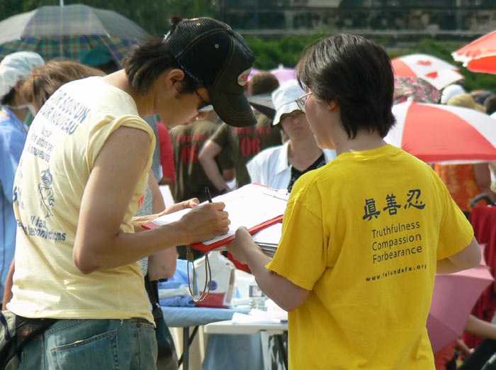 一位女士向一个学员示意想要一份真相传单给她的朋友,学员就用自己掌握的简单英语与她讲起法轮功被迫害的真相,特别讲到中共活体摘取法轮功学员人体器官牟取暴利,焚尸灭迹的暴行。进而谈到7月6日加拿大前亚太司长、资深国会议员乔高(David Kilgour)和国际著名人权律师麦塔斯(David Mates)公布的独立调查报告,进一步的证实活摘法轮功学员器官罪恶的存在。她说她在网上看到了,她很关注中国的人权状况。学员就送她一份“九评”,告诉她这里面写明了共产党的邪恶本质,看后就会明白为什么中国的人权状况会这么糟糕。同时又告诉她很多中国人因为看了九评,明白了中共的邪恶本质,目前已有近1千2百万中国人退出了中共组织。她当即到征签台前签了名。离开时她祝学员成功。不一会儿,学员又看到她带着一位女士径直到征签台前签名声援反迫害。同时又帮她拿了一份揭露活摘器官的资料。