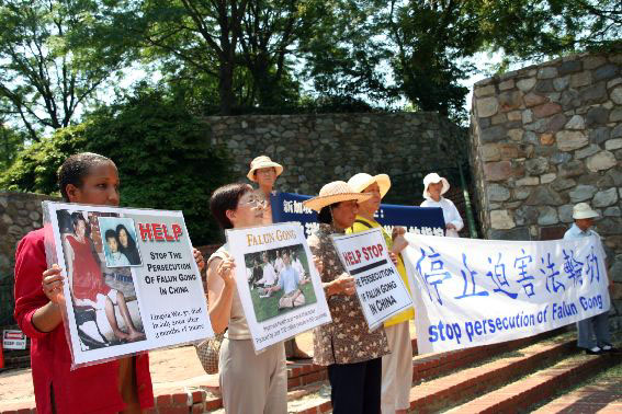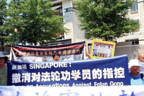 7月18日中午,华盛顿DC气温高达华氏100多度。法轮功学员冒着酷热,手持写有“新加坡:撤销对法轮功学员的指控”、“停止迫害法轮功”、“呼吁国际社会全面调查中共劳教所”的横幅,以及揭示法轮功学员受迫害真相的展板静静地站在新加坡驻美大使馆前。