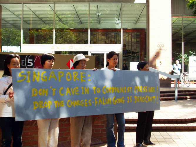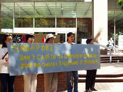 法轮功学员在新加坡领馆前打出的横幅