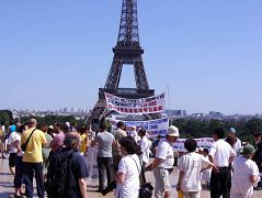2006年7月15、16日,法轮功学员在巴黎人权广场、巴黎Montparnasse火车站前揭露中共七年来对法轮功学员的迫害。
