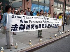 2006年7月19日晚,近百名纽约法轮功学员在中领馆前集会,谴责中共对法轮功长达7年的残酷迫害,呼吁国际社会尽全力停止迫害,严惩元凶。