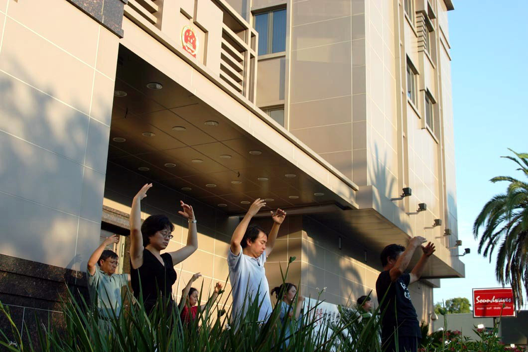 法轮功学员在中领馆前抗议 ,是反迫害讲真相中的一部份。几年来,无论酷暑及寒风,学员们持之以恒的努力已被当地居民所知,高中、大学的学生也将其作为研究的课题,还有一些居民将此作为景点而拍照。