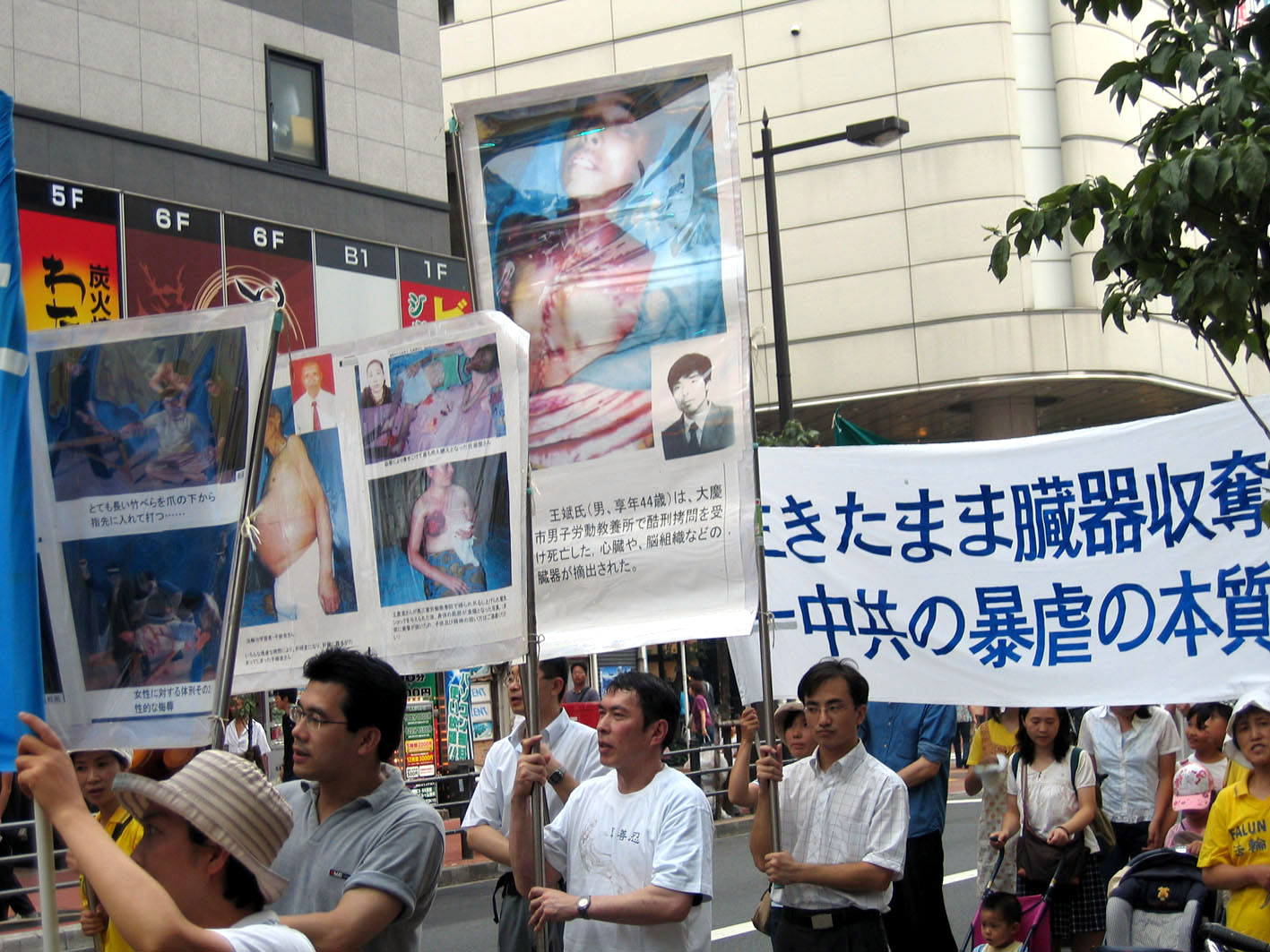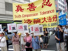 下午2点开始从池袋公园出发进行了两个多小时的抗议游行,人们手举着各种横幅和遭受残酷迫害致死的法轮功学员的巨幅照片,一边行进一边呼喊口号,并向沿途路人发送资料。