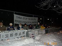 ![]() 冰天雪地里渥太华中国使馆前的烛光悼念 |