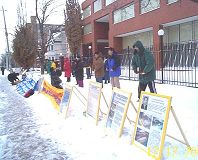 2001年的春天,雨天比往年来的多,风疾雨大,学员们的衣服常常从里湿到外,在倒春寒的日子,这承受可想而知。可雪越大、风雨越疾,来炼功的人越多,大家的心也越齐。一次,有两个华人在领馆门前冻得直跺脚,一个说:这样的天还来炼功,给多少钱我也不干。学员告诉他们:我们都是自愿来的,没拿过别人一分钱,看看我们的报纸吧,你就知道我们为什么要来了,这也是大家省吃俭用积攒的钱印的。那两人不好意思地接下了报纸。”