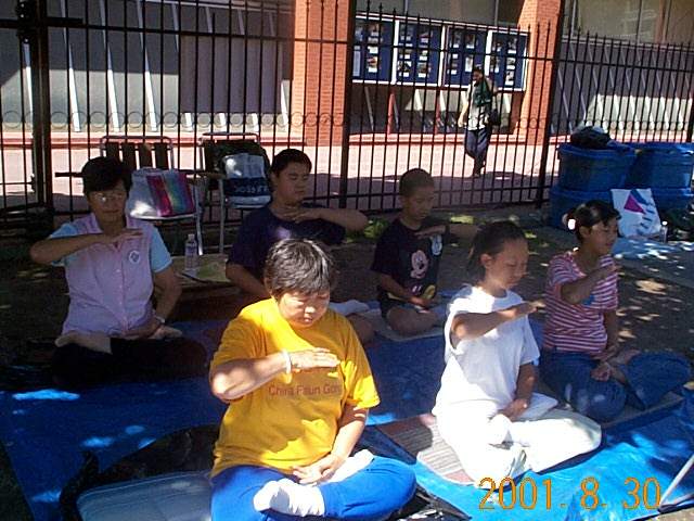 李女士:“2001年6月中,哈尔滨万家劳教所计划在7月20日前全部转化被非法关押的法轮功学员。女学员们被狱警用电棍、武装带毒打,被连续几昼夜‘吊飞机’、甚至被男警当众亵侮、抬进男监由男犯轮奸……随后,15名女学员被狱方宣称集体上吊‘自杀’,130位法轮功学员绝食抗议迫害,生命危在旦夕。为救援同修,唤起人们对迫害的关注,年近六旬的西人学员康妮从7月开始,在中领馆前连续10天24小时请愿;从8月1日起,十四岁女孩叶瑾和年近七旬的李翩翩老人也开始了为时一个月的静坐,后来又不断有同修加入,他们中有刚参加了长途步行250英里的紧急救援活动的60岁的阿姨,有多伦多大学的女博士生,有天性活泼的13岁男孩……从8月19日开始,同修们又开始连续48或72小时接力绝食绝水请愿。”