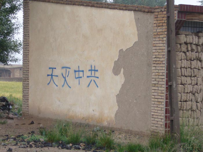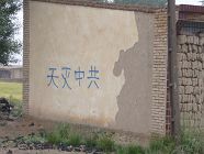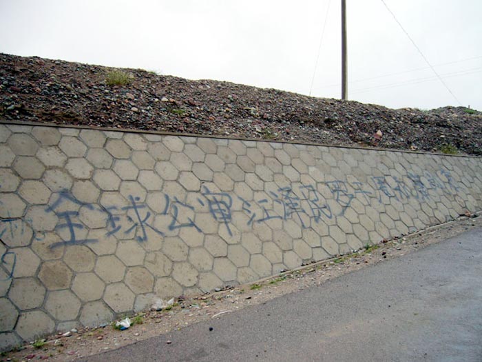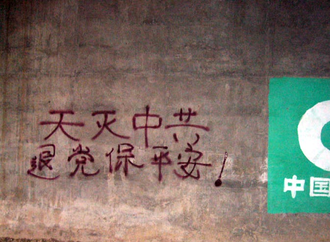 笔者有幸在2006年7月20日在某国道的路边拍摄到了当地大法弟子书写的劝退标语。