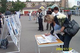 市中心胜利广场人潮不绝,脚步匆匆的人们,不论男女老少,突然无不被眼前的模拟演示震惊了!人们停下来站在近处仔细观看,听着讲解,又一一读了展板, 纷纷在给瑞典政府书上签名,要求政府出面调查,并制止中共对法轮功的迫害。