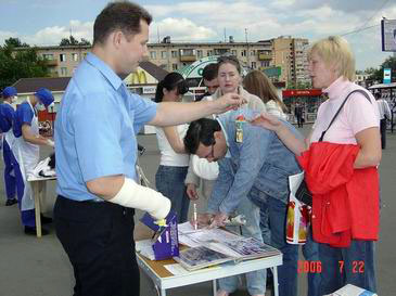 【明慧网2006年7月23日】2006年7月20日,中共迫害法轮功已长达七年,部份瑞典法轮功学员在斯德哥尔摩再次举办活摘器官及酷刑的模拟演示,向游人、市民揭露中共暴行。