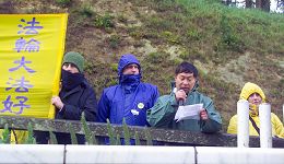 法轮功学员们举着“七年和平抗暴,坚信真善忍”,“抗议中共活体摘取法轮功学员器官”,以及“法轮功呼吁国际社会全面调查中共劳教所”等横幅站在风雨中。许多过往的汽车司机都向坚忍的法轮功学员们鸣笛致意。