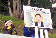 刚刚由联合国难民署营救来新西兰的法轮功学员和彦辰也到场,强烈抗议中共恶党对其家人的迫害,并要求无条件释放她至今仍被非法关在“洗脑班”的父亲和三普。