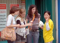 这一路对法轮功学员来讲,辛苦也很多,有的时候,一整天都下雨;有时找住处很费周折,很多的时候一天都吃不上东西,每天都要从一个郡赶到下一个郡;同时还要准备第二天要用的资料,学员们尽最大的努力,在两周的时间里,把每一个地方的活动都做的很好,有的男学员长时间的打横幅(爱尔兰四面环海,风很大,打横幅很吃力和辛苦),有的学员炼功,有的负责征集签名,大家默契有效的配合让更多的民众了解了大法真相。