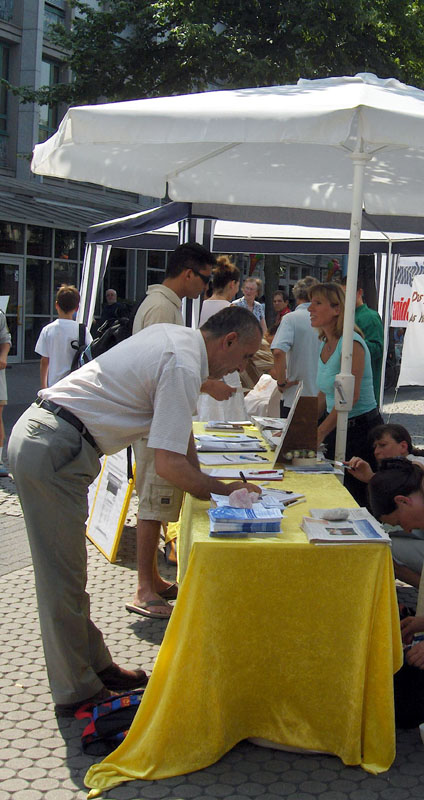 在曼海姆市中心,往来的行人很多,人们看到反酷刑展,听到喇叭里叙述的迫害详情,无不驻足,震惊之余,纷纷走到展位的桌子前签名,表达对中共暴行的谴责。