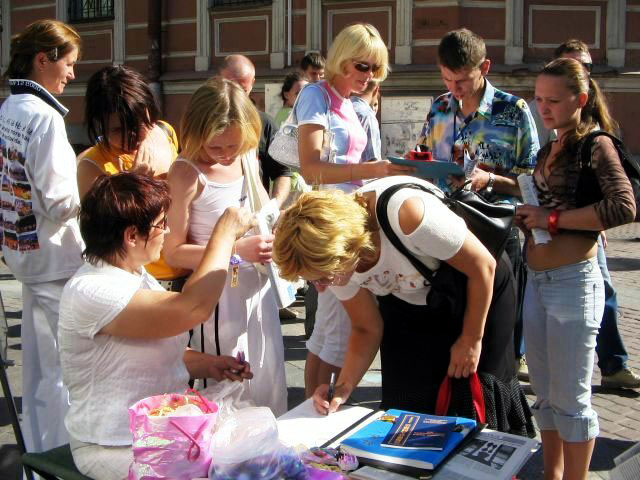 ![]() 排队签名支持法轮功反迫害 | ![]() 活动现场,民众在认真听学员讲真相 |