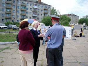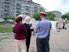 【明慧网2006年7月28日】2006年7月23日,俄罗斯雷宾斯克市法轮功学员在市区巴列特广场举行活动,向人们介绍法轮大法的美好和中共七年来残酷法轮功的真相。广场上摆放着各种真相展板;部份学员向人们演示五套功法;还有一张小桌子放着各种做纸莲花的材料,学员一边教人叠莲花一边讲真相。莲花代表着修炼者圣洁和美好的品质,出淤泥而不染。小小纸莲花人见人爱,一个孩子双手捧着莲花高兴的说他闻见了香味,不仅是孩子,连执勤的警察都陆续地来听真相,把纸莲花挂在警车上。