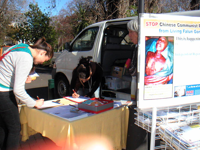 上图中这位在新西兰长大的学生,是奥克兰大学的研究生,准备写有关历史研究的论文,看了摄影展后他想从共产党的历史这个角度写中共为什么要迫害法轮功这群信仰真、善、忍的好人,并且惨无人道的活摘法轮功学员的器官牟取暴利。法轮功学员认真的告诉他:你好好看看《九评共产党》,就会了解共产党邪恶的历史,就能写的出来了。他表示一定要好好读《九评共产党》,跳出老套的框框来完成这篇论文。他还签名呼吁尽早结束中共对法轮功的残酷迫害。