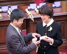 ![]() 法轮功学员、沃敦居民陈儒庆先生(左)舍己救人获魁北克省“优秀公民”称号 |