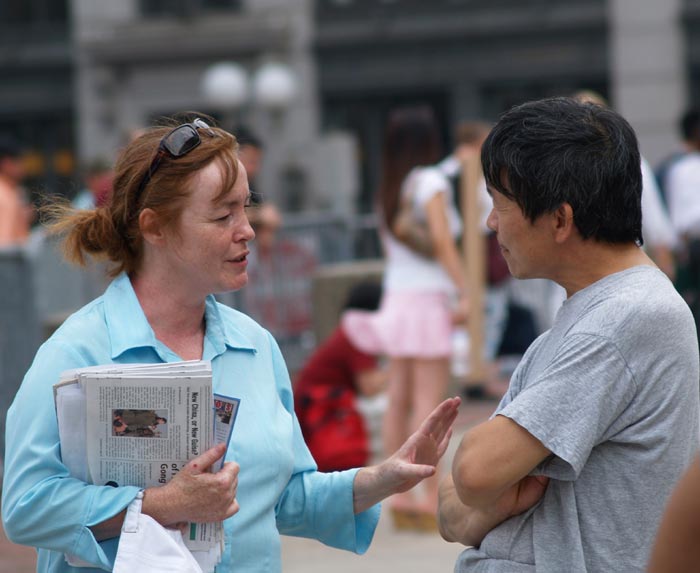 许多人知道真相之后在现场就落泪了,表示要帮助受迫害的中国法轮功学员。有些要买《转法轮》书,有的当场就读起《转法轮》。一个宗教团体说:“我们要为法轮功祈祷。”