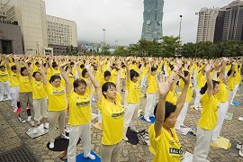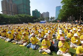 ![]() 2005年中坜学员在校园运动会表演功法 | ![]() 2006年5月13日台北市政府前千人炼功庆祝世界法轮大法日 |