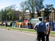 30日,法轮功学员们按照预定的时间来到中领馆前,早已有大批警察在现场等候,法轮功学员们马上向他们讲真相。这时,以前就知道真相的警官说:“你们拉开横幅抗议吧,我们不会阻拦的。”大家拉开横幅开始抗议,现场有一位“莫斯科之声”广播电台的记者进行了采访,并在当天晚上的节目里对抗议活动做了正面报道。开始抗议的随后一小时里,中领馆的人出来给每个学员拍照和录像,并不断的向俄罗斯政府部门施加压力,现场警官的手机不停的响,看得出他们是在顶着来自上面的巨大压力。后来又来了一位级别更高的警官(中校),请求法轮功学员们结束抗议活动,否则他的官职将不保。在这种情况下,法轮功学员们结束了抗议活动,挪到离中领馆稍远一点的河对岸继续发正念。