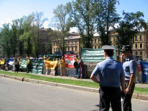预定举行抗议活动的前三天,法轮功学员们到圣彼得堡各级政府部门和警察机关广泛的讲清真相,尽管由于邪恶中共的巨大压力使政府官员们不敢批准抗议,但他们看到法轮功学员们态度坚决,所以这次听真相特别认真,表示理解,并希望法轮功学员们以后给他们送来更多的资料。