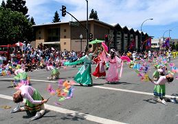 【明慧网2006年7月5日】(明慧记者黄凯莉旧金山湾区报导)2006年7月4日,美国北加州最盛大的独立日游行在红木城举行。法轮功团体作为游行队伍中唯一的华裔团体应邀参加。法轮功学员的多姿多彩、气势浩大的队伍、婀娜动人的舞蹈、祥和的功法表演、及喜庆的腰鼓表演赢得了主办者和观众的热烈掌声和欢呼声。主办者说,明年还要邀请法轮功再来。