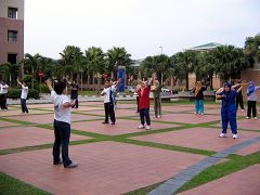 7月4日星期二傍晚六时,下班后的公务员聚集在办公大楼前的空地上,学炼法轮功。数十位公务员在暮色中跟着学员学动作,气氛宁静祥和。炼完后,大家说还要炼,于是学员和他们约好第二个星期再来。