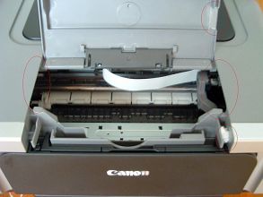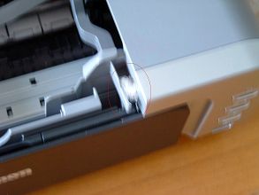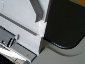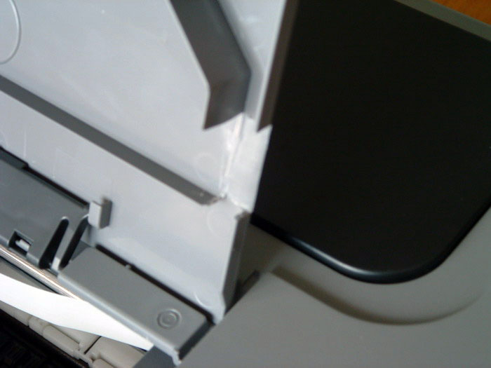 (锯的时候先用布等物垫在打印机的里边,以免碎末掉在机器里,)锯右边的时候(不改也可以但不对称,不美观)把打印机通上电,这时打印机头的壳就会停在中间,(再把电源拔掉,这样锯起来方便),锯好后,把机器倒扣以清除不小心掉到里面的碎末。之后再把机盖卸下用刀切成如图状再安上就可以了。
