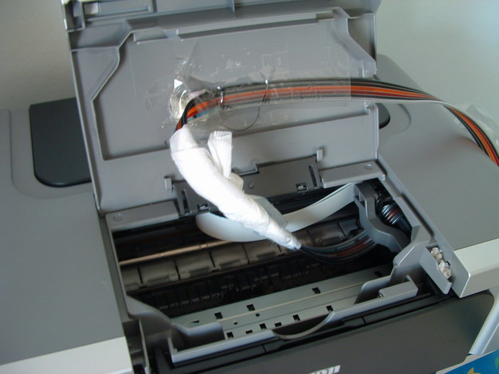 (2)用清洗液将废墨垫洗净,取下墨盒,往墨柱的莲花头上滴几滴清洗液,再将墨盒装上,墨车复位,浸泡6小时以上,然后清洗。如还不通则转下面。