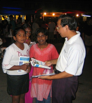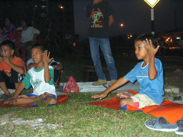 逛夜市的大部份都是马来人和印尼人,也有部份印度人。法轮功学员首先播放教功VCD,祥和的炼功音乐响起,吸引了人潮围观,更有一群马来小孩跟着炼功。接着学员就播放真相短片,同时派发资料给逛夜市的民众