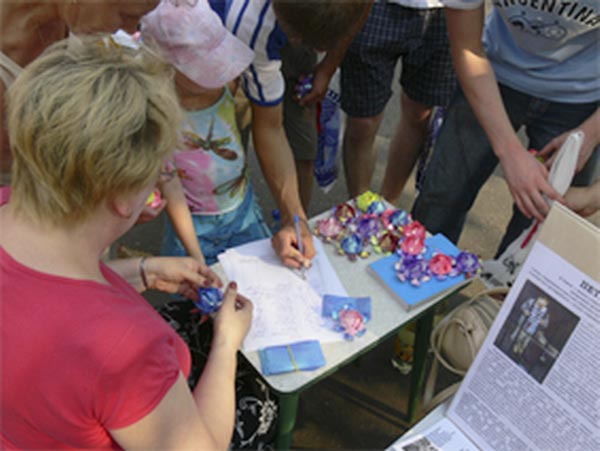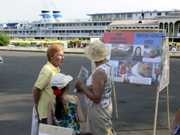 伏尔加河边靠了一艘从下新城(Nishne novgorod)驶来的游轮,很多从船上下来的游客高兴的接过学员们派发的真相资料,还有很多从城里游览完回到船边的游人停下来学叠纸莲花,认真听学员讲真相,许多人在征签簿上签名支持法轮功反迫害。