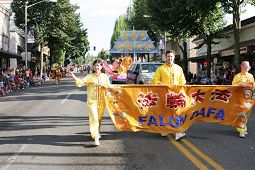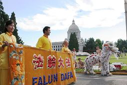 【明慧网2006年8月1日】2006年7月22日,美国华盛顿州首府奥林匹亚(Olympia)举行了一年一度的Lake Fair游行。法轮功学员今年首次参加了该市的游行。一位早已熟悉法轮功的观众在观看游行后感慨的对学员说:“当我看到法轮功队伍来到奥林匹亚时,我真高兴!出于尊重我站了起来,我心里喊着‘法轮大法好!’”