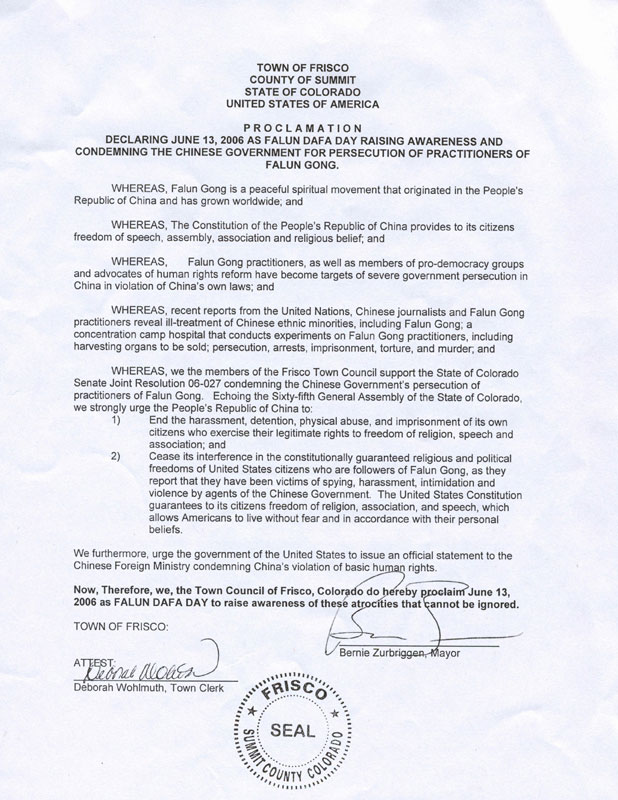 鉴此,我们,科罗拉多州弗瑞斯科市议会,在此宣布2006年6月13日为法轮大法日,并呼吁民众关注这些暴行,我们不能对暴行置之不理。