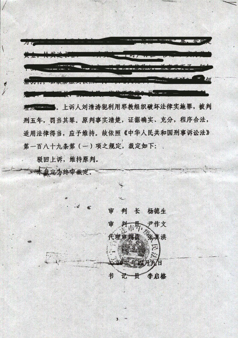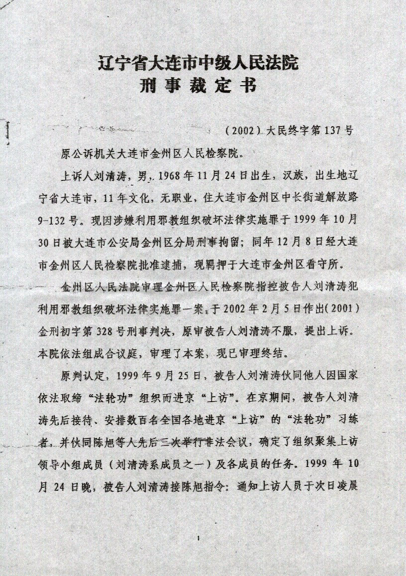 刘清涛,男,39岁,家住金州区解放路中长街道8委6组,原金州区辅导员。99年7.20以后当地派出所不断骚扰,威逼刘清涛每天一早到派出所报到,晚上才让回家。99年10月,刘清涛进京上访被非法关押在大连驻京办事处,受到残酷迫害,从13楼一直被毒打到1楼,很多大连同修都亲眼所见,恶警无耻的说他“真抗打”。后送到金州看守所被非法关押2年半,其间受到精神和肉体上的折磨,经常被铐在暖气管上,蹲不下站不起,不许家属探视,每天超负荷奴役劳动,被强迫干有毒对身体有害的活,在关押期间不开庭不审判,严重违法,后在大法弟子一再追问的情况下,关在瓦房店监狱近2个月待押后,于2002年6月25日被金州区法院非法判处有期徒刑5年,关押到迫害最严重辽阳铧子监狱。在关押期间刘清涛受到各种酷刑折磨,被奴役劳动经常到晚10点多还干不完,刘清涛曾被迫害出现冠心病状态,用救护车送到医院抢救,未通知家属,直到2004年10月29日被释放。