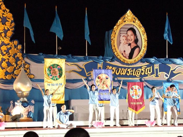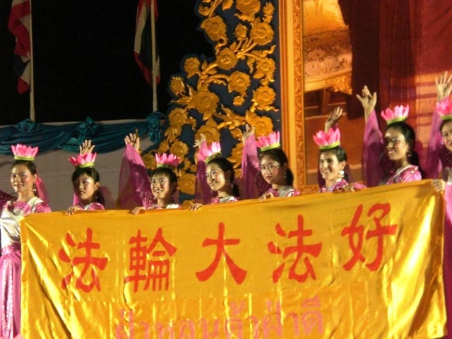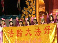 8月13日晚上,法轮功学员参加了皇家田广场庆祝活动,表演了舞龙旗、仙女舞、腰鼓、舞剧、五套功法演示、合唱等节目,向民众展现了法轮大法的美好。精彩的演出博得观众阵阵掌声。