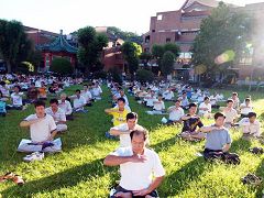 迎着晨曦,法轮功学员在剑潭活动中心前草坪上晨炼