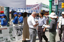 来自古巴的一对夫妇经过唐人街。太太停下来对法轮功学员说:“他(丈夫)已经被共产党彻底的洗脑了,他的整个家族都是这样。”太太从学员手中接过《九评》,感激的对学员说:“非常感谢!我会天天读给他听的,就算他睡着了,我还会继续给他读的。”