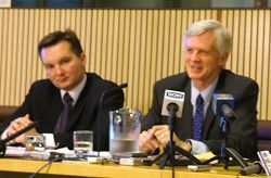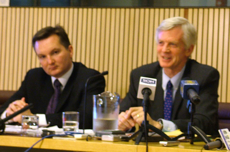 ![]() 澳洲国会议员奎斯•伯文(左)和大卫•乔高(右)在澳国会大厦新闻发布会上 |