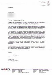 新西兰毛利党领袖Tariana Turia在2006年8月7日的回信中写道:“对于你们的经历,特别是你父母所遭受的一切,及你与家人6年不能团聚的痛苦情形,我深感不安。”