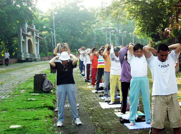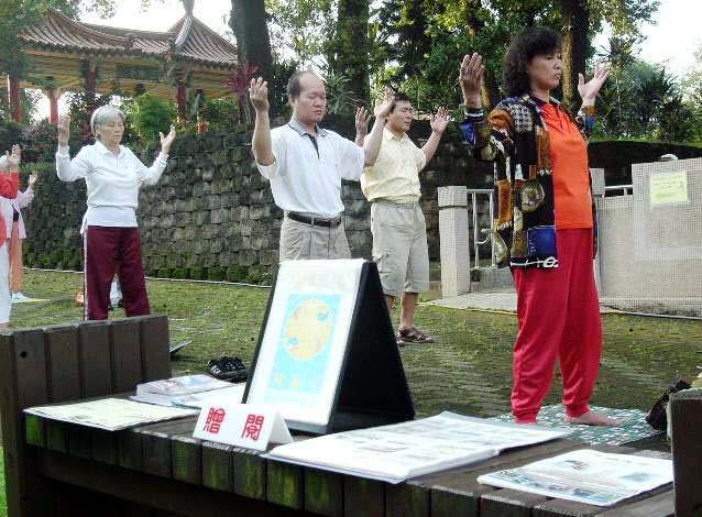 中山公园是台湾嘉义市历史最悠久的公园,具有深厚的人文背景,每天早晨有很多市民到这里来散步、运动;我们的炼功点设在通往射日塔的公园入口处的步道旁,这里场地广阔,是进入公园必经之地,走进来的市民一眼就能看到学员炼功的画面。