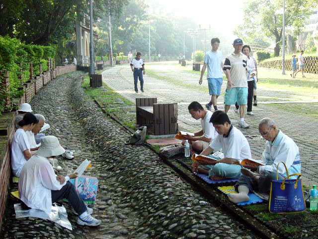 这个炼功点的辅导员是一位将近八十岁的学员,他每天骑摩托车到炼功点来,在路上就已经背了两遍《论语》。他也经常鼓励同修炼完功后留下来学法,每天读一讲《转法轮》。十几位学员在高大的枫香树下,盘坐在步道旁沟渠的石头上,一起学法,往来的行人听到了琅琅书声,有的会停下脚步倾听,有的注目观看,共同沐浴在佛法的温煦祥和里。