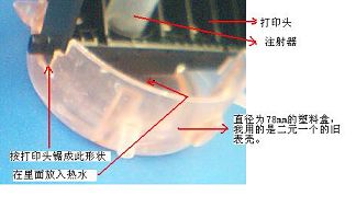 清洗时在塑料盒中放入八、九十度左右的热水,把打印头放在塑料盒上,用改造后的注射器多抽几次。再在注射器中抽入干净的八九十度的热水,用上面的方法压几次。要多抽少压。