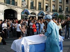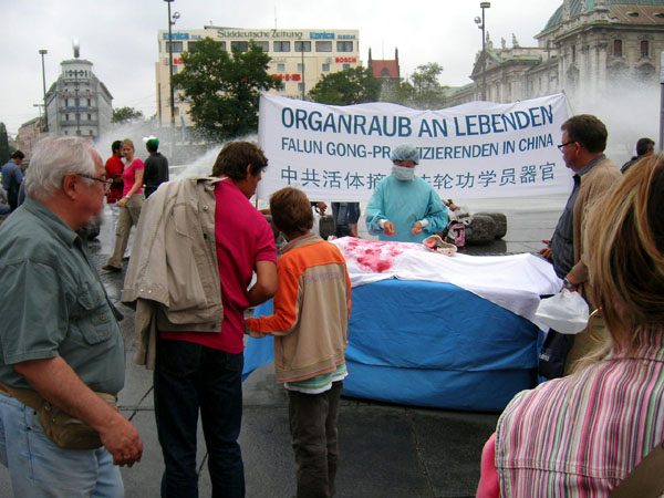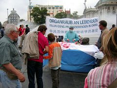 卡尔斯广场位于慕尼黑最繁华地带,整年行人、游客不断,展台和模拟中共活体摘取法轮功学员器官的手术台一摆好,马上就有人过来询问。当人们了解到中共的恶行、正在中国发生的一系列迫害民众的事实,尤其是中共活体摘取法轮功学员器官的暴行,人们被震惊和震怒了,不少人马上签名呼吁制止中共的残暴。在整个活动过程中,有不少前来旅游的中国人经过卡尔斯广场,他们接过了真相报纸并与法轮功学员交谈,也有人当场声明退出中共。