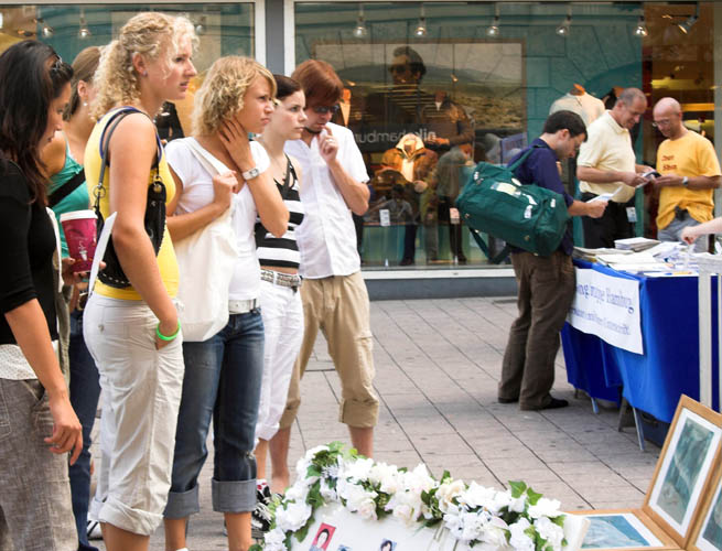 一位路过的德国老先生对他的太太讲:我完全能够想象,他们(中共)能够做出这样的事情来。一位德国女老师主动要求带一些资料回去,以便告诉她的学生真相。