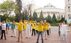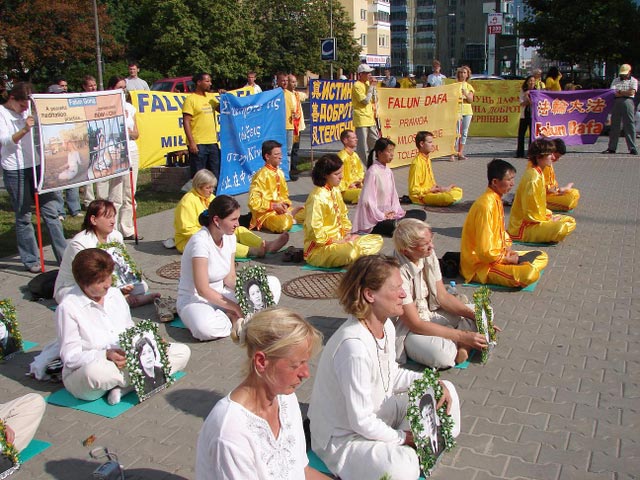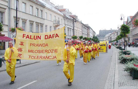 8月12日,星期六早上,学员们在波兰国会大厦前集体炼功,接着举行了游行活动,之后到中使馆前抗议中共的迫害。